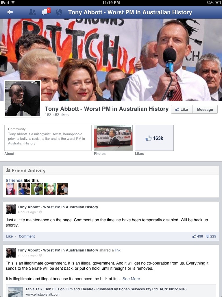 I think it’s good excellent Gen Y-ers and people in general feel passionate about the election result, but ‘liking’ a page won’t uninstall Prime Minister Abbott. Join a union, join an NGO [non-government organisation] like Greenpeace, Get up! Etc. People power! This election was make or break for Gen Y. And we won’t know properly its effects until the next one in 2016/17. Don’t scoff at us, older generations, we’re learning like you did, but we didn’t have a Gough Whitlam “It’s Time” campaign.