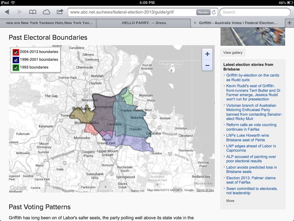 The red is its current size, and the blue and green are its previous shapes. Electoral boundaries change according to population. I.e. if Griffith has 10,000 people who vote, then there is a big flood that sees 2,000 people leave — the the boundaries have to be redrawn to account for births, deaths, emigration and immigration, to keep it all as proportional as possible!