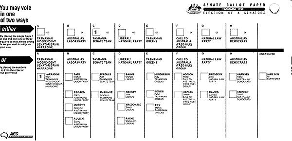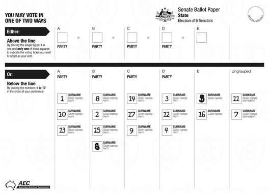 If you vote above the line, you are allocating your vote to a Political Party. By putting a ‘1’ in a box, you accept the preferences of the party [with regard to their candidates]. Their preference is easy to see, the top candidate under the line is their first choice, the next one down is the second and so on.