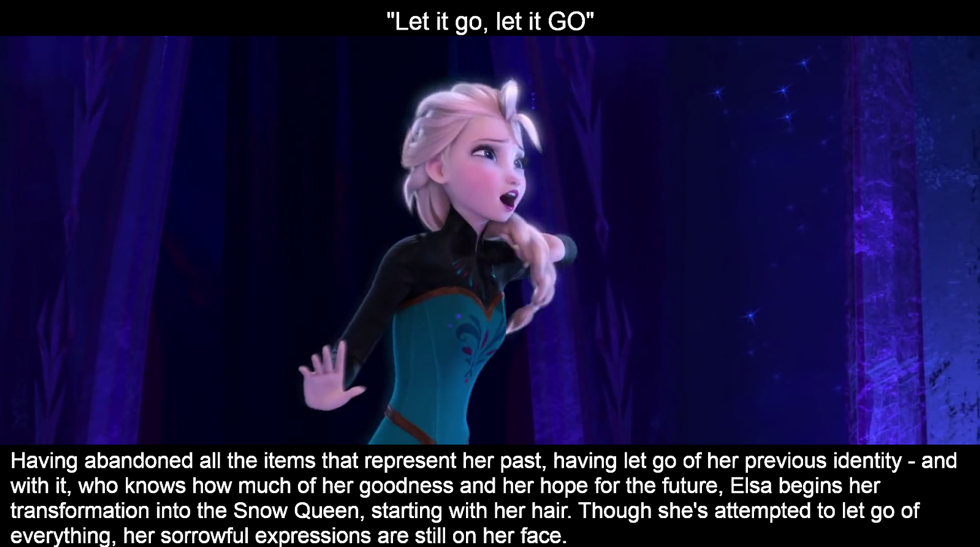 - My friend N – “ I figured it was a bit disturbing on purpose. Her parents’ prejudice and the “conceal, don’t feel” mentality made Elsa ashamed of her power, which is what caused her power to go haywire and cause a never-ending winter, and so she thought isolation was the only acceptable response based on that upbringing. It was acceptance of her powers and her decision to leave isolation (and return to Anna who loves & supports her & doesn’t require her to suppress her powers) that allows Elsa to regain control and end the never-ending winter. The act of true love that Elsa performs by saving Anna doesn’t just save Anna, it saves Elsa too. But I also like your interpretation of it as a journey of self mastery! #OverthinkingIt“